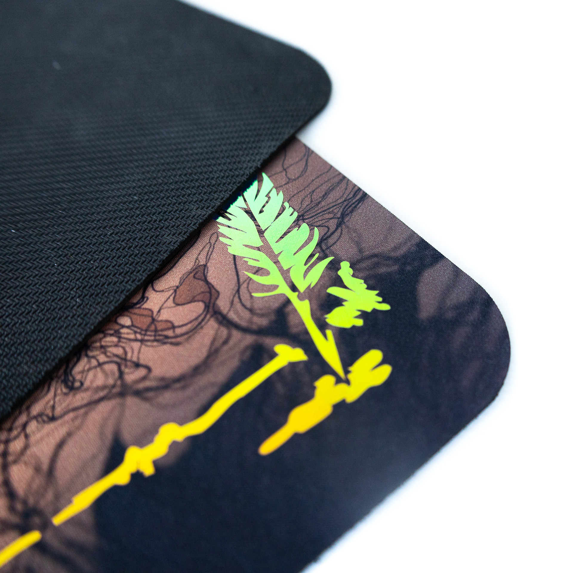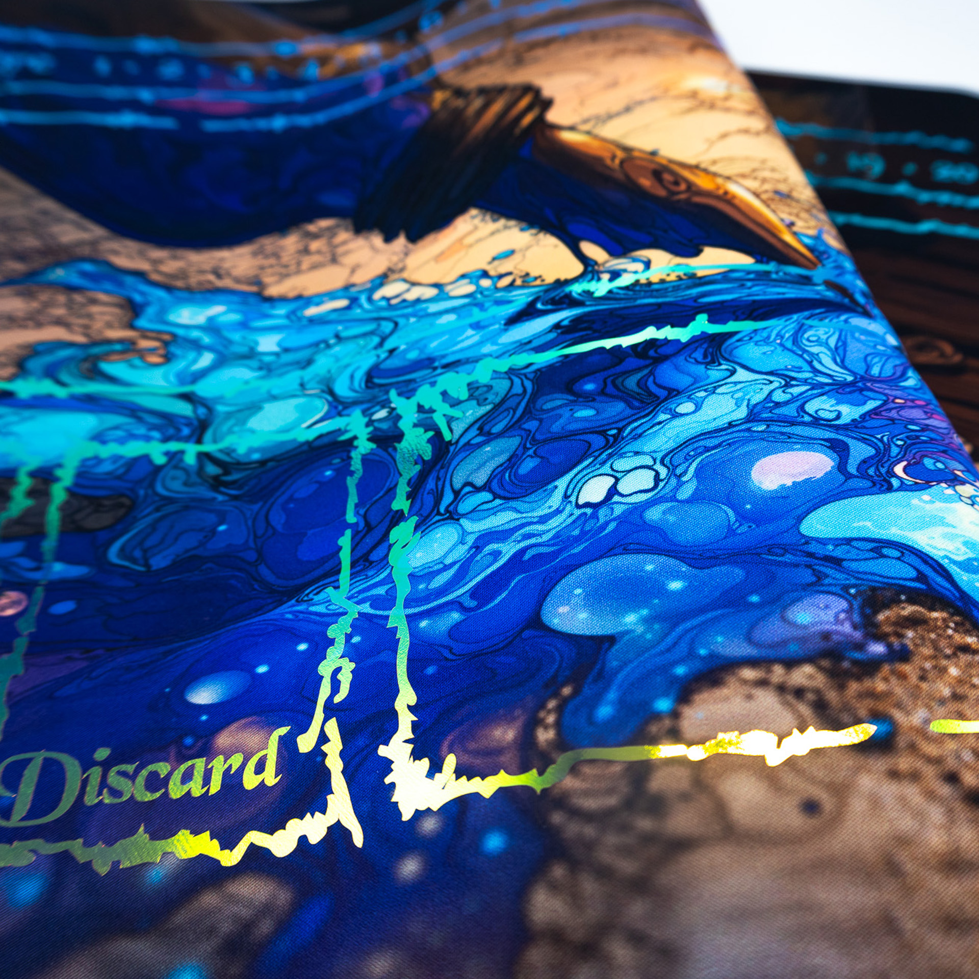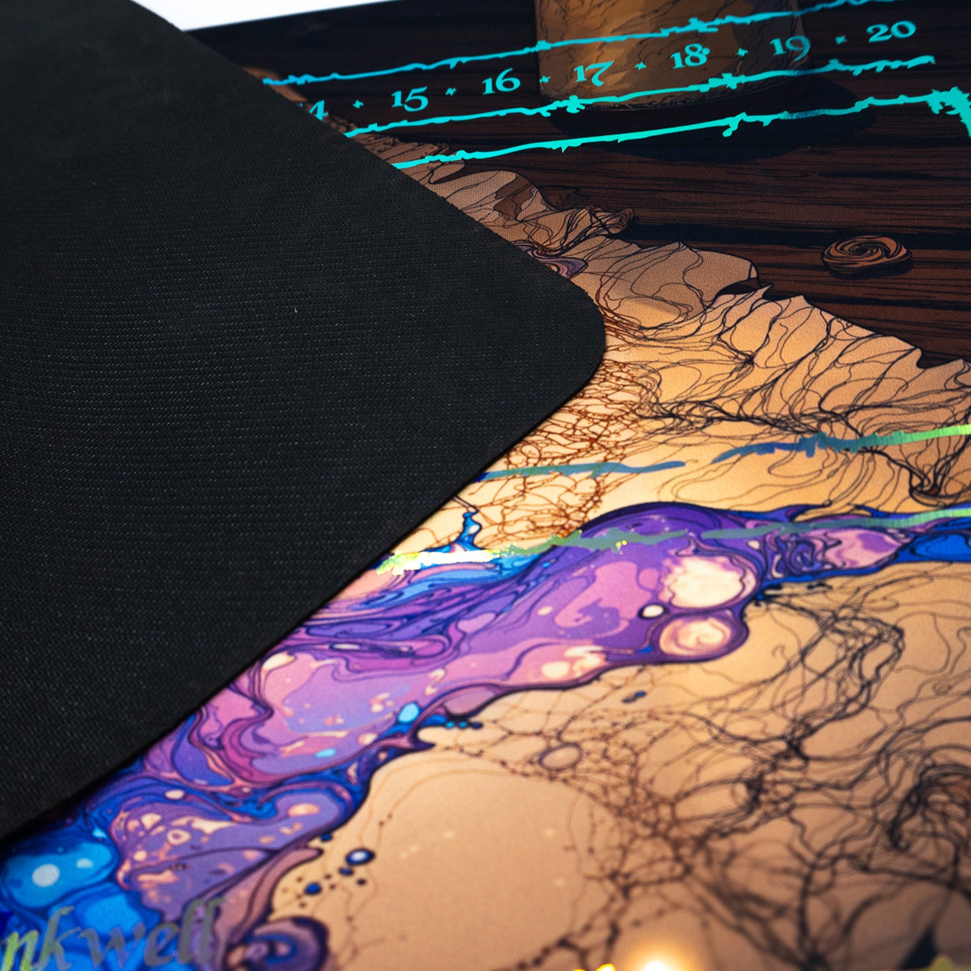 Rozmiar 61x35 cm zapewnia wygodną przestrzeń na ułożenie kart, a gumowa podstawa grubości 2 mm stabilnie przylega do stołu, chroniąc karty przed przesuwaniem. Wzór inspirowany rozlewającym się atramentem to nie tylko estetyka, ale też klimat – każda partia staje się częścią opowieści, w której to Ty jesteś autorem.