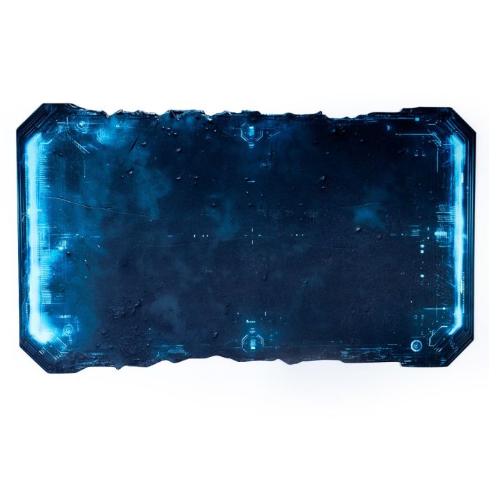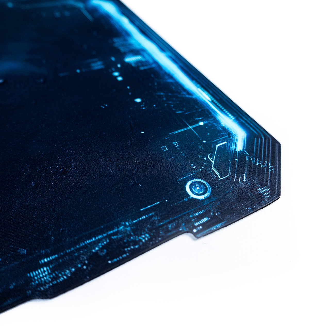 Najbardziej charakterystyczną cechą tego produktu jest jego nieregularny format, czyli die-cut. Zrezygnowaliśmy z klasycznego prostokąta na rzecz formy przypominającej wyświetlany w powietrzu, "poszarpany" cyfrowo hologram lub wyłamany panel sterowania. Taki zabieg stylistyczny sprawia, że mata wygląda nowocześnie i drapieżnie. Mimo nietypowych krawędzi, powierzchnia użytkowa została zachowana w taki sposób, abyś mógł swobodnie operować myszką w grach FPS lub rozłożyć swój układ kart w karciankach LCG. To design, który łączy w sobie artystyczną wizję z pełną funkcjonalnością, której oczekujesz od profesjonalnego sprzętu.