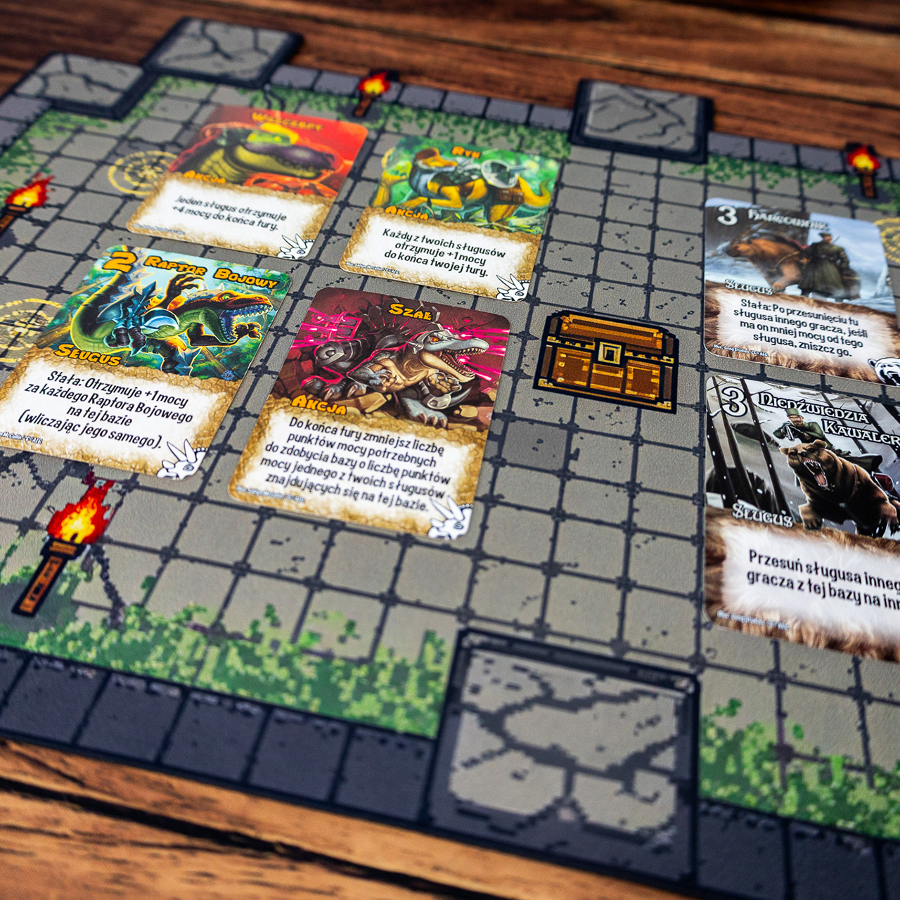 Pikselowa siatka widoczna na nadruku może być pomocna przy grach wymagających poruszania się po polach lub układania kart w rzędach, co dodatkowo podnosi walory użytkowe produktu. Ciemna kolorystyka kamiennej posadzki jest praktyczna, ponieważ ewentualne zabrudzenia są na niej mniej widoczne, a kolorowe koszulki kart i figurki doskonale kontrastują z tłem. To mata, która sprawdzi się zarówno w domowym zaciszu, jak i na wyjeździe, gdyż łatwo ją zwinąć i spakować do plecaka.