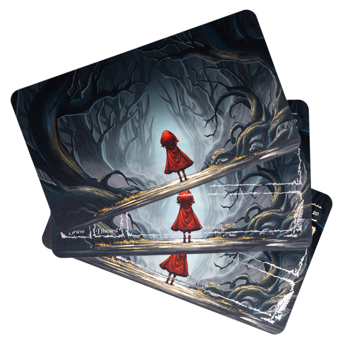 Odważ się wejść do mrocznego lasu, gdzie każda ścieżka kryje tajemnicę. Mata Samotny Czerwony Kapturek to połączenie nastrojowej grafiki z pełną funkcjonalnością turniejową. Oferujemy wariant z samą grafiką oraz wersję standardową z nadrukowanymi strefami i ekskluzywną edycję Premium ze strefami uszlachetnionymi srebrną folią. Produkt jest w pełni kompatybilny z grą Lorcana i posiada licznik Lore oraz miejsce na kałamarz. Poczuj klimat baśni na swoim stole. Gramy razem!