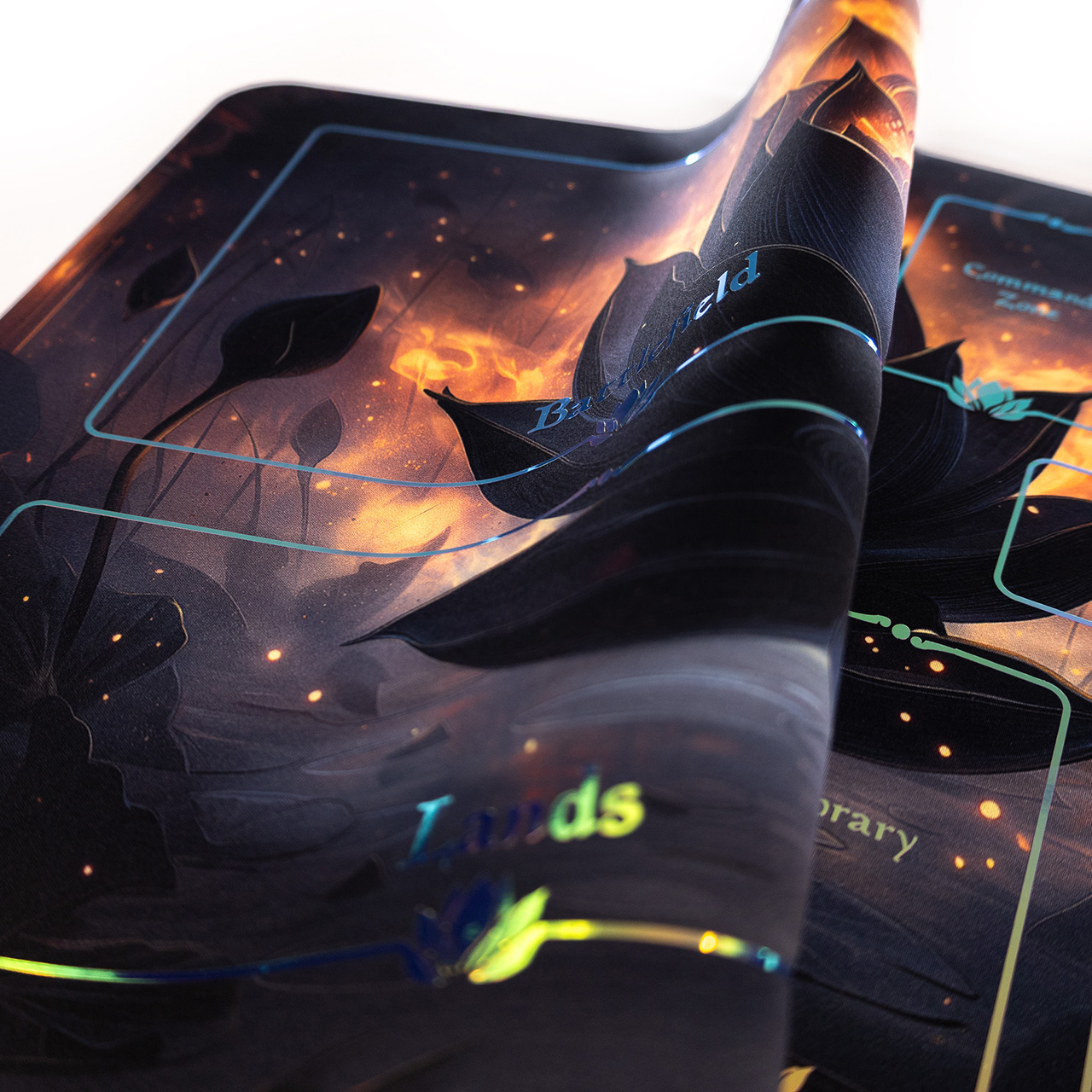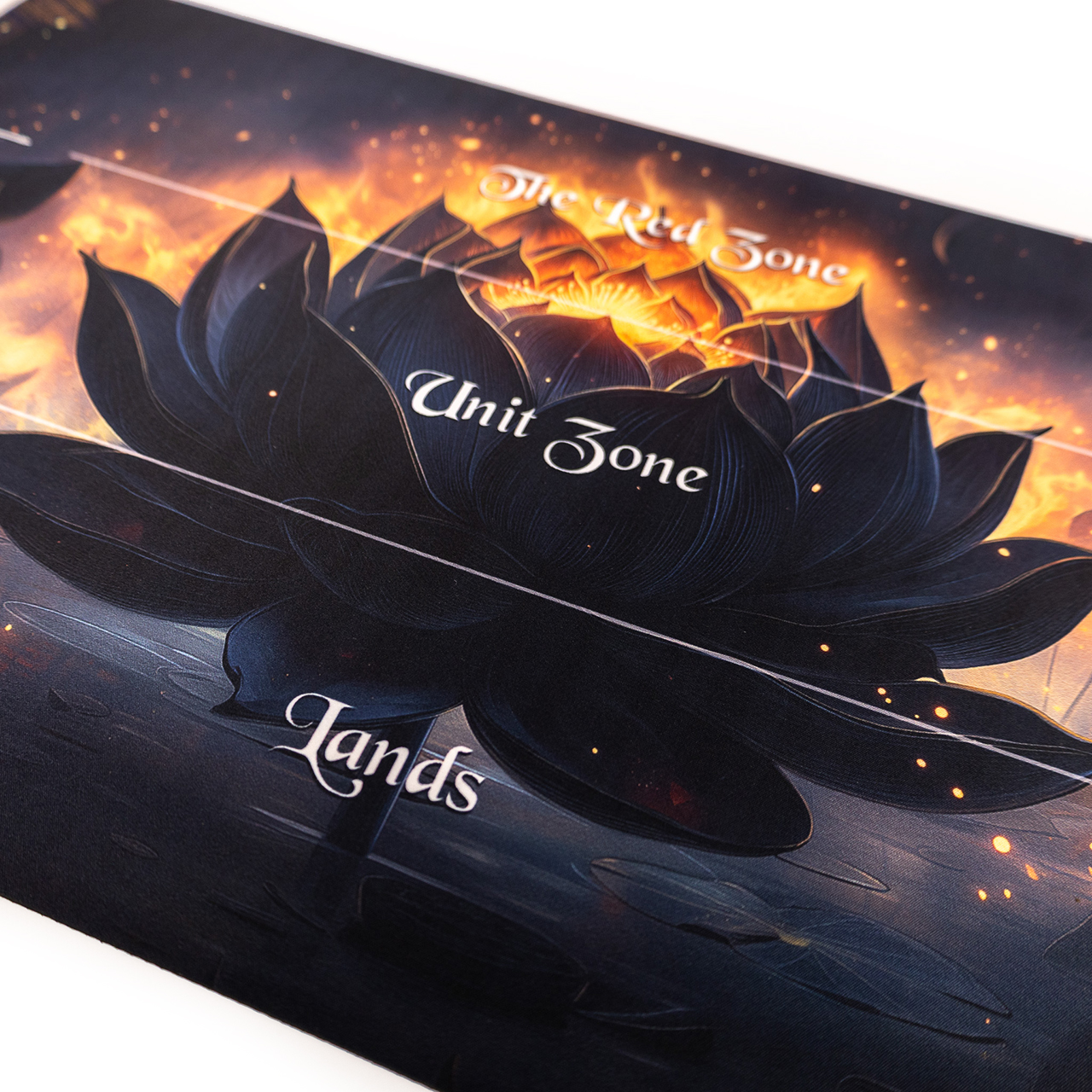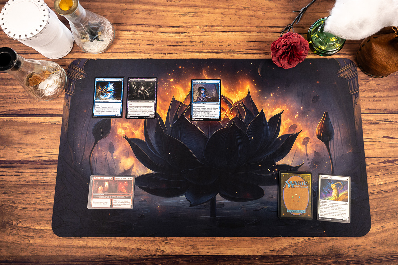 W świecie magii niewiele artefaktów budzi taki respekt jak Czarny Lotos. Nasza mata nawiązuje do tej legendy, prezentując kwiat, który nie tylko rozkwita, ale płonie czystą energią. Ciemne, nastrojowe tło kontrastuje z żarem wydobywającym się z wnętrza rośliny, tworząc idealną scenerię dla talii opartych na niszczycielskiej sile, mrocznych rytuałach czy kontroli zasobów. To projekt dla graczy, którzy wiedzą, że zwycięstwo wymaga poświęceń, a każda tura przybliża ich do ostatecznej dominacji nad stołem.