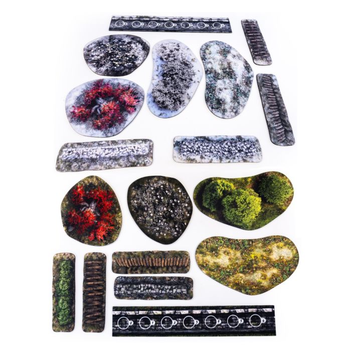Twoja rozgrywka to godziny planowania taktyki, malowania figurek i studiowania zasad stronnictw walczących o Żelazny Tron. Prowadząc do boju oddziały Lannisterów lub polegając na odwadze ludzi Północy pod sztandarem Starków, potrzebujesz pola bitwy odzwierciedlającego surowe realia tego uniwersum. Prezentowany zestaw terenów 2D został zaprojektowany jako w pełni kompatybilny z grą bitewną A Song of Ice and Fire. Otrzymujesz wyposażenie pozwalające odwzorować zróżnicowane krajobrazy znane z kart powieści. Do Twojej dyspozycji oddajemy dwa warianty klimatyczne. Wersja wiosenna obfituje w zielone drzewa, bujne żywopłoty, kamienne mury i bagniska. Wariant zimowy przeniesie Twoje siły w skute lodem ostępy idealne dla Nocnej Straży. W obu opcjach znajdziesz kultowe drzewa serca z czerwonymi liśćmi, makabryczne stosy ciał, drewniane palisady oraz specjalne miarki ułatwiające rozstawianie sił. Każdy element opowiada własną historię i pozwala tworzyć niezapomniane scenariusze na stole.