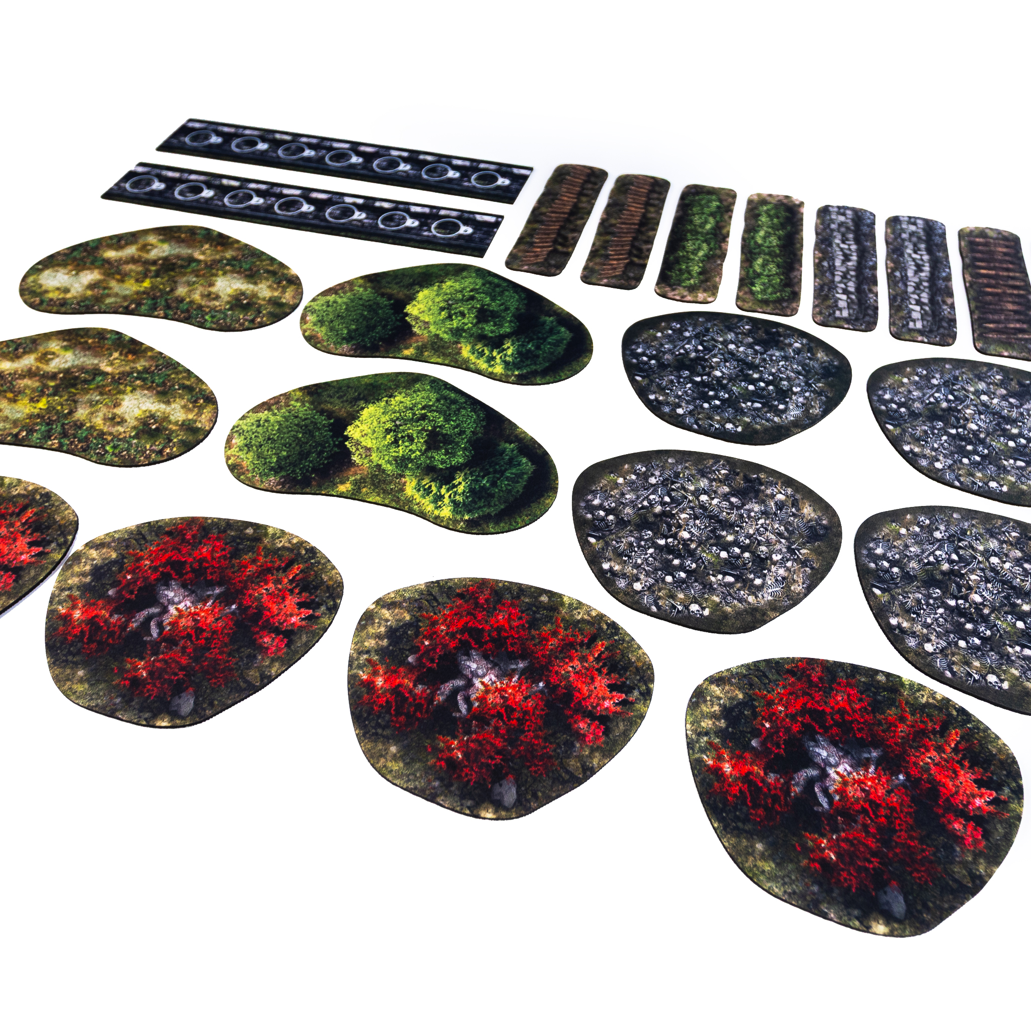 Gry bitewne oparte na systemie oddziałów na tackach ruchowych bywają bezlitosne dla trójwymiarowych makiet. Przepychanie bloków piechoty przez plastikowe przeszkody często kończy się przewróconymi figurkami i nerwowym odmierzaniem odległości. Wybierając płaskie tereny 2D zyskujesz swobodę manewrowania. Kształty i rozmiary poszczególnych znaczników zostały stworzone tak, aby idealnie współgrać z mechaniką gry. Lasy skutecznie zablokują linię wzroku wrogich łuczników, żywopłoty i mury zapewnią kluczową osłonę przed szarżą, a makabryczne stosy ciał oraz bagna stworzą niebezpieczny i spowalniający ruch obszar. Płaska struktura precyzyjnie wyznacza granice strefy wpływającej na statystyki oddziału. To funkcjonalność połączona z doskonałym odwzorowaniem detali. Otrzymujesz przemyślane narzędzie ułatwiające organizację gry, dzięki któremu możesz skupić się na przechytrzeniu przeciwnika i zagrywaniu kart taktyk. Zapomnij o walce ze zsuwającymi się modelami. To komfort doceniony przez tysiące graczy.