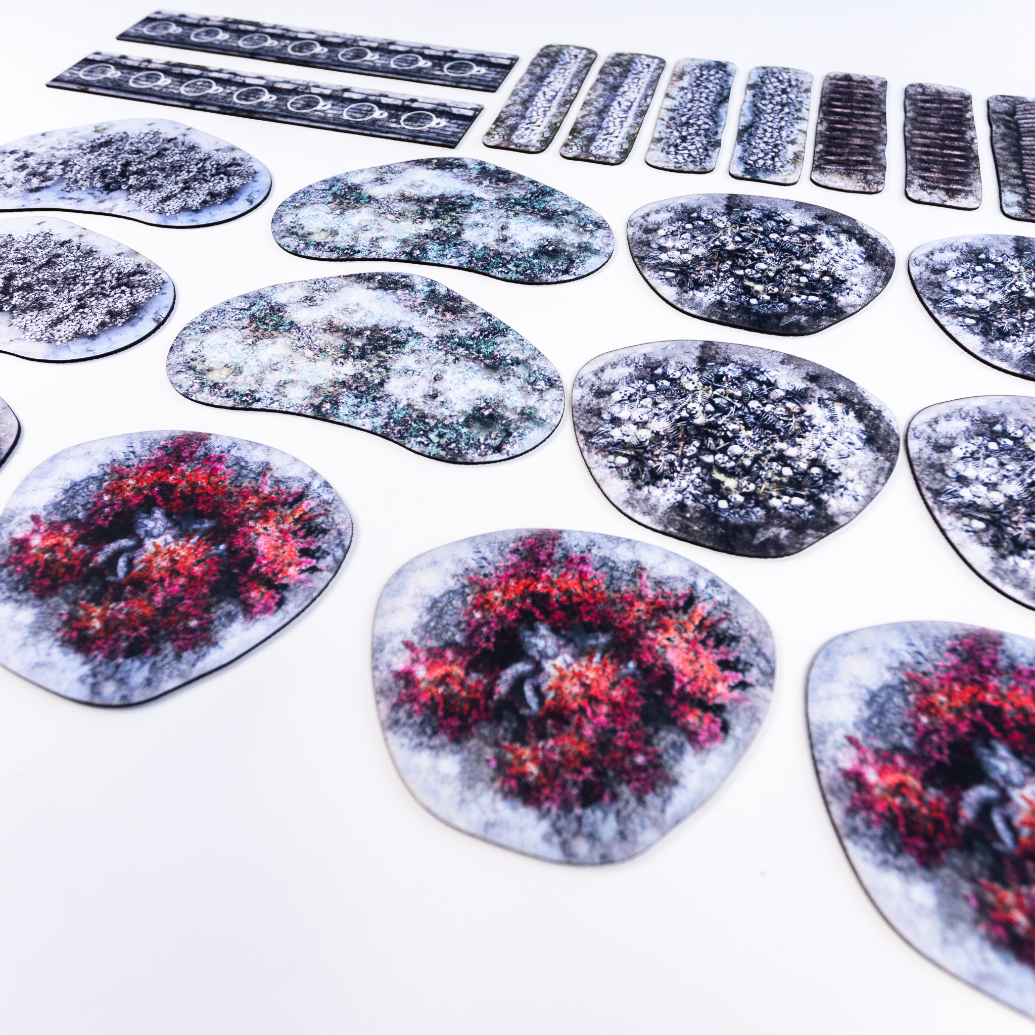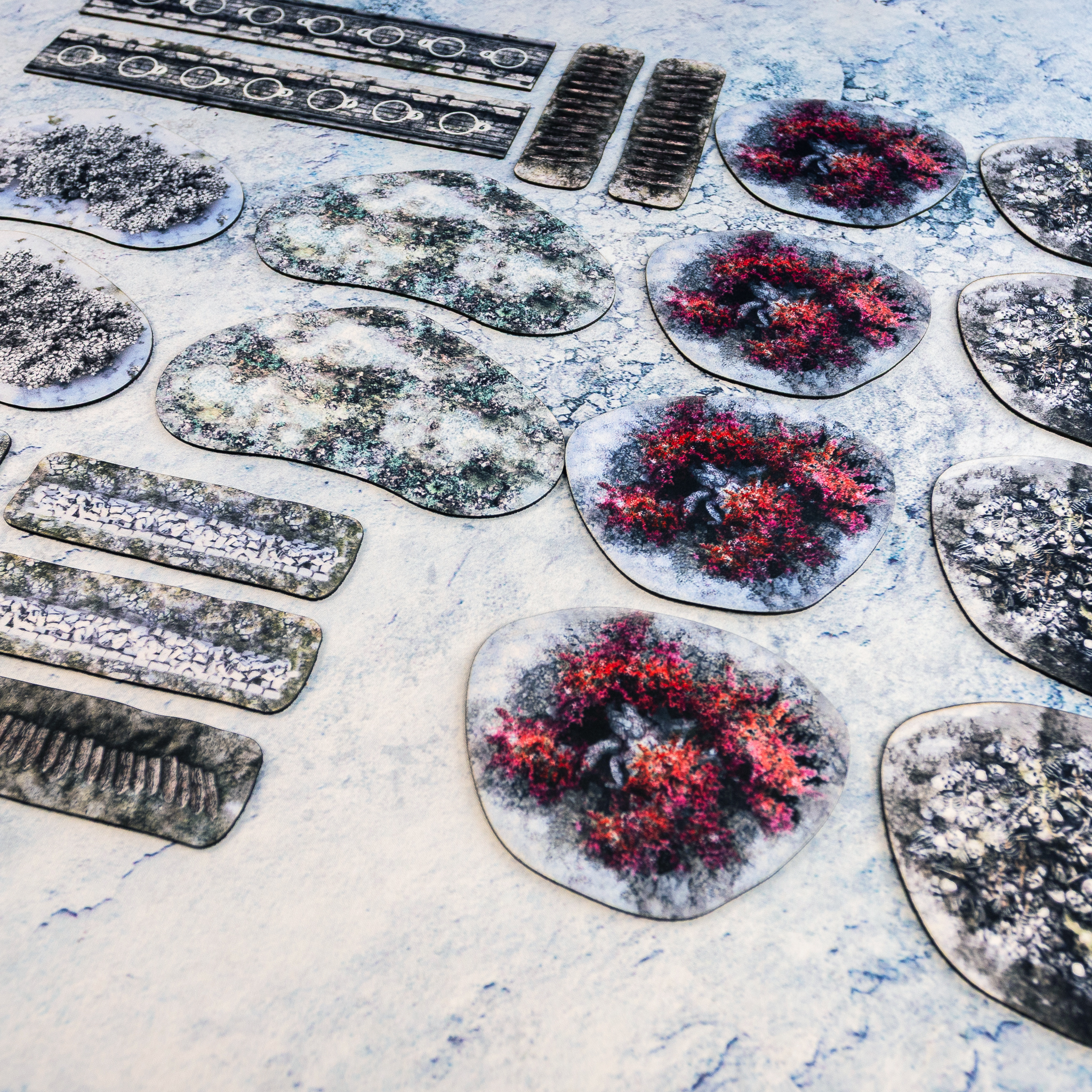 Jako gracze doskonale wiemy, że komponenty lądujące na blacie muszą znosić niezwykle dużo. Częste rzuty kośćmi, przesuwanie ciężkich oddziałów i transport w torbach wymagają materiałów najwyższej próby. Komplet został wykonany z elastycznego i bardzo wytrzymałego materiału gumowego przypominającego podkładki pod mysz. Spód każdego elementu pokryty jest specjalną warstwą antypoślizgową, dzięki czemu wszystkie znaczniki pozostają tam, gdzie je rozstawisz przed bitwą. Zapewnia to stabilność podczas najbardziej dynamicznych starć o losy siedmiu królestw. Wierzchnia warstwa z gładkiej tkaniny gwarantuje ostre nadruki odporne na ścieranie, co ułatwia identyfikację typu terenu na polu bitwy. Otrzymujesz solidny produkt stworzony przez hobbystów dla hobbystów dostosowany do rygorystycznych potrzeb wargamingu. Ciesz się płynną rozgrywką. Miłego grania!