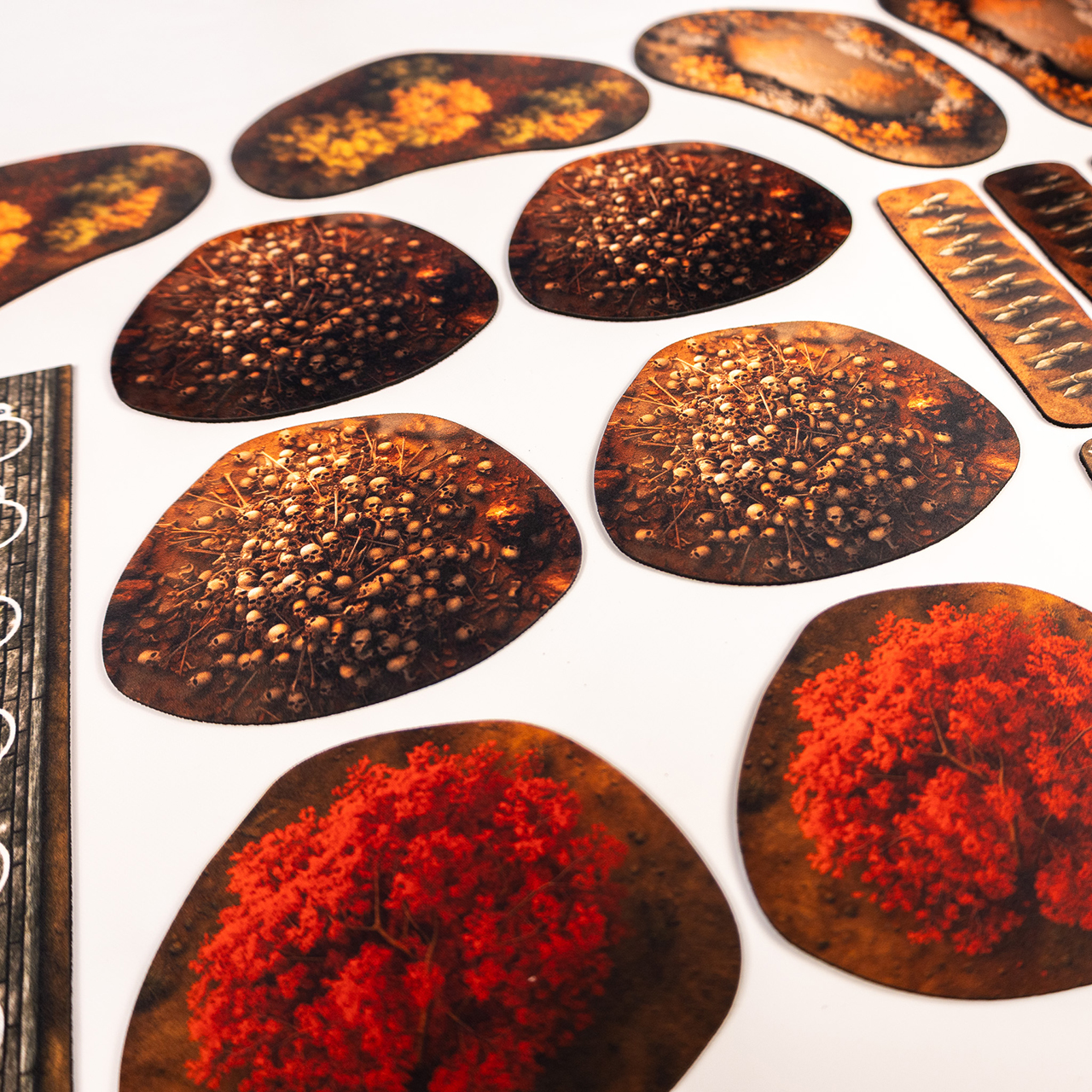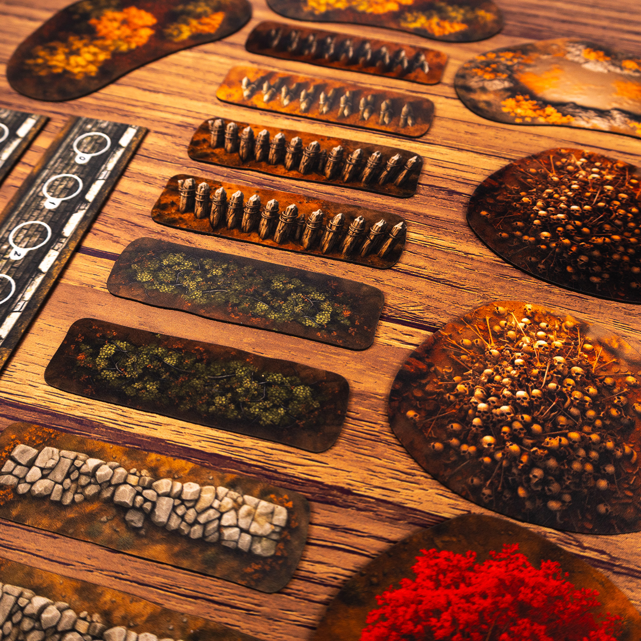 Wojna Pięciu Królów nie bierze jeńców, a pole bitwy jest równie niebezpieczne co oręż przeciwnika. Kiedy stajesz do walki o Żelazny Tron, każdy skrawek terenu ma znaczenie. Zestaw terenów 2D w edycji Bloody Dawn został zaprojektowany tak, by oddać surowy, jesienny klimat Siedmiu Królestw, gdzie opadające liście mieszają się z krwią poległych. To nie są zwykłe znaczniki – to fragmenty świata George’a R.R. Martina przeniesione na Twój stół w formie, która łączy estetykę z bezkompromisową użytecznością.