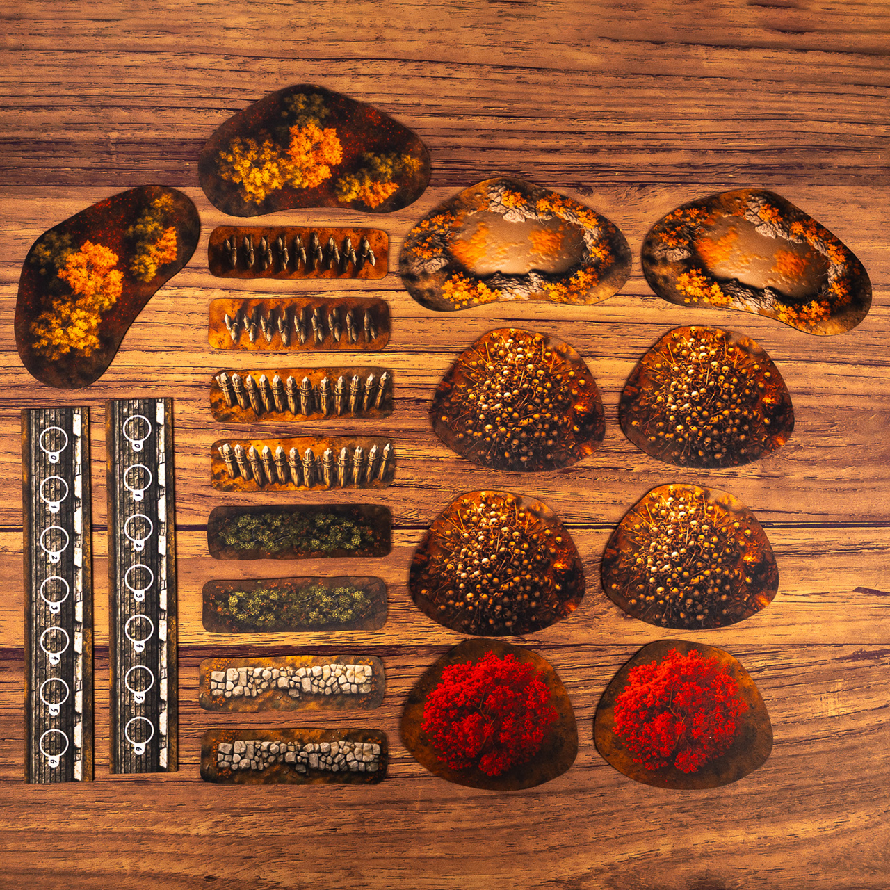2x Palisada, 2x Drewniana barykada (Stakes), 2x Murek, 2x Żywopłot: Zestaw przeszkód terenowych, które pozwalają kształtować pole bitwy, blokować szarże i tworzyć strefy obronne dla Twoich oddziałów.