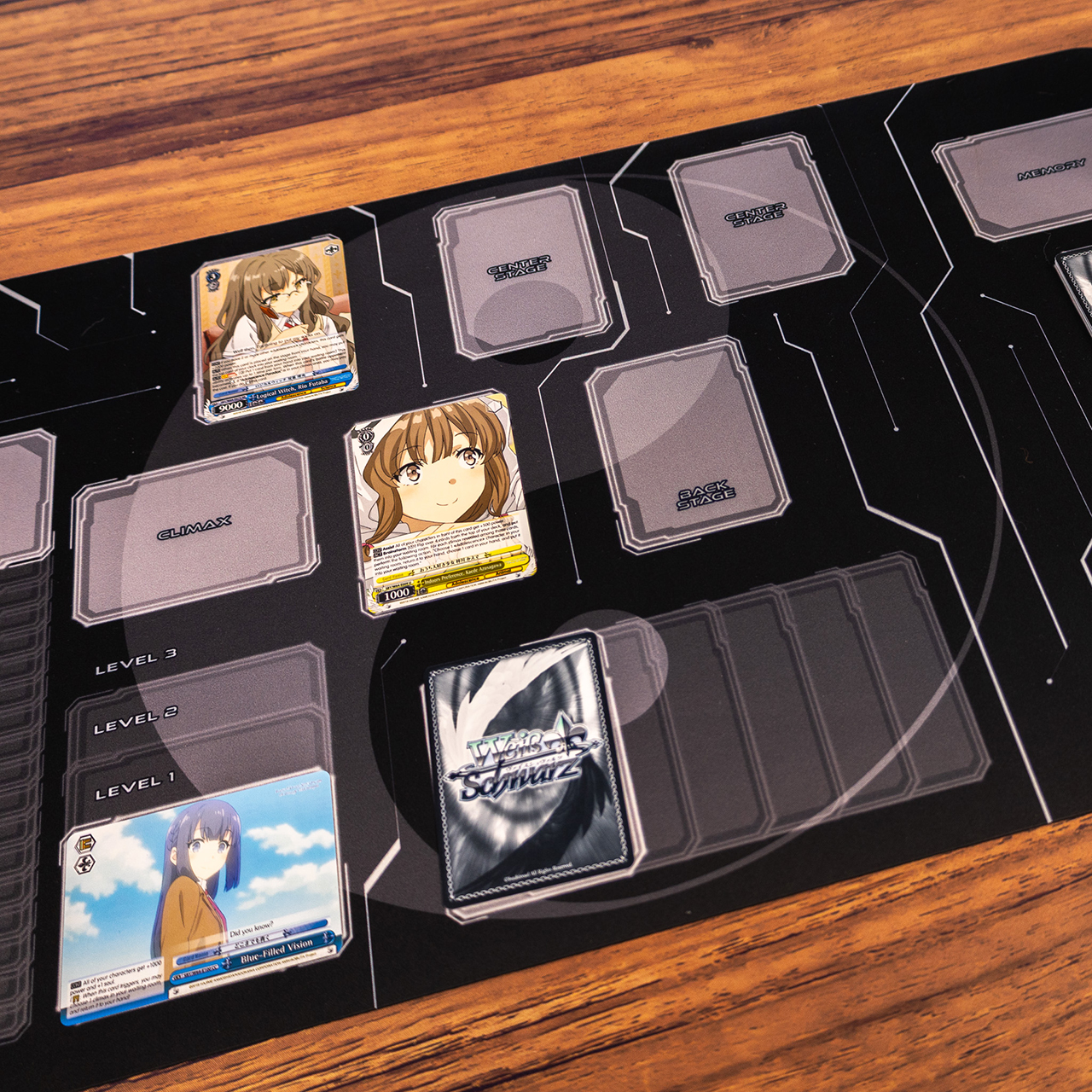 ● Climax, Deck i Waiting Room: Niezbędne strefy do zarządzania talią i kartami wsparcia. Dzięki temu mata jest idealna zarówno dla weteranów szukających precyzji, jak i dla nowych graczy uczących się rozmieszczenia kart.