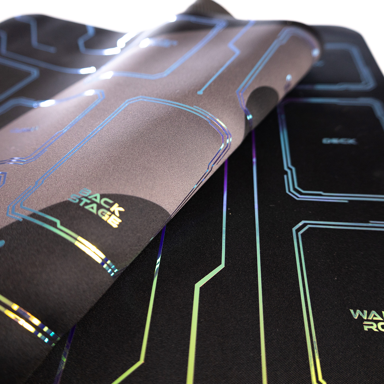 Podstawą maty jest wysokogatunkowa guma neoprenowa o grubości 2 mm. Gwarantuje ona, że produkt płasko przylega do stołu i nie przesuwa się, zapewniając stabilną bazę dla Twojej talii. Wierzchnia warstwa to gładki poliester, który jest bezpieczny dla koszulek i ułatwia podnoszenie oraz przesuwanie kart. W wersji holograficznej folia jest trwale wgrzana w materiał, co zapewnia jej odporność na ścieranie podczas standardowego użytkowania.