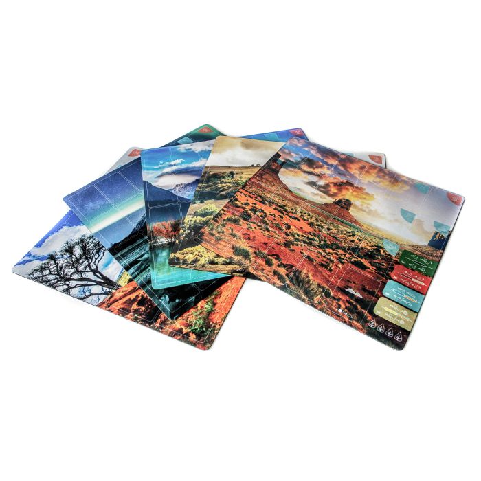 Antypoślizgowe, gumowe planszetki gracza dedykowane do gry Ziemia. Maty przedstawiają pięć różnych krajobrazów. Taka oprawa wizualna pozwala lepiej wczuć się w grę, co znacznie zwiększa doznania z rozgrywki. Poza zwiększonymi walorami estetycznymi gry, mata dodatkowo chroni karty i akcesoria przed zniszczeniem oraz przesuwaniem.