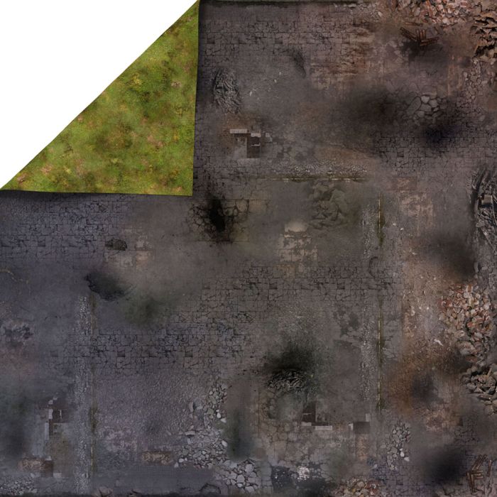 Popękane ulice, gruzy i ślady po eksplozjach – "Zrujnowane Miasto" to idealne pole bitwy dla gier osadzonych w postapokaliptycznym i wojennym klimacie. Mata 48”x48” (122x122 cm) doskonale sprawdzi się w Warhammer 40,000, Infinity, Bolt Action, Kill Team oraz innych systemach bitewnych, oferując strategiczne ulice i ciasne przejścia do taktycznych manewrów. Dostępna w wersji gumowej, lateksowej, antislip i dwustronnej – wybierz wariant idealny dla siebie!